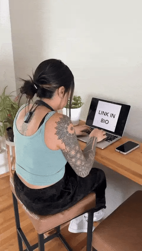Lo pones en tu espalda (súper discreto). Cada vez que te encorvas, vibra suavemente. Tu cerebro recibe la señal y corriges.